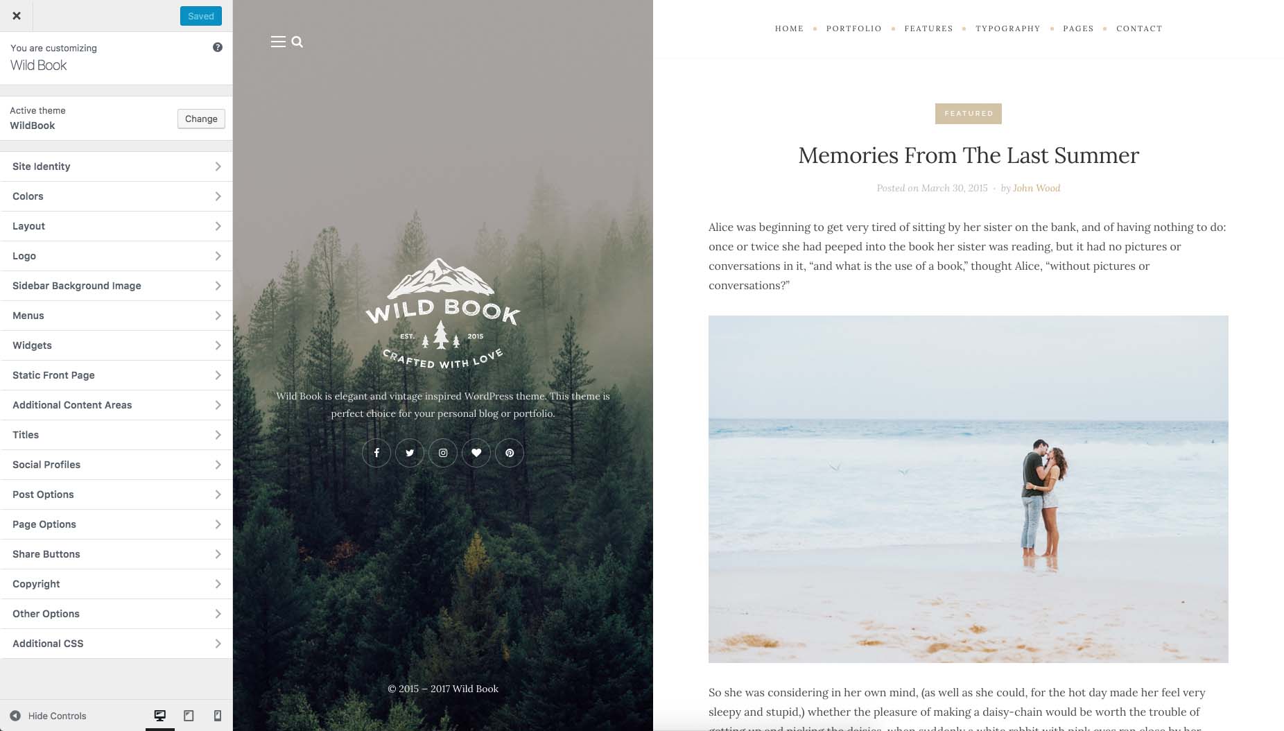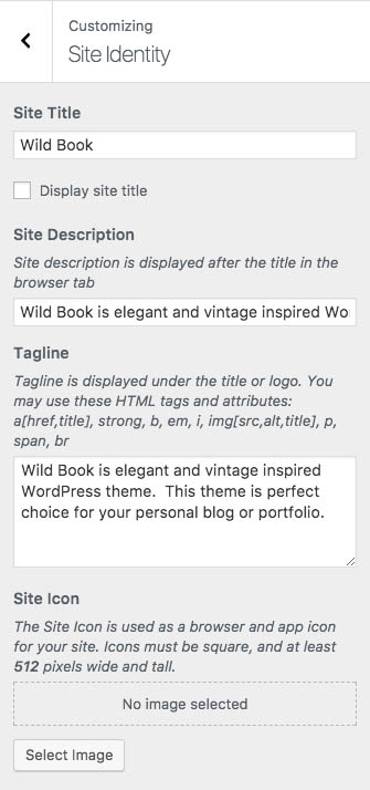 Wild Book uses WordPress Customizer API, this makes the theme very easy to configure. The Customizer is a framework for live-previewing any change to WordPress. It provides a simple and consistent interface for users to customize various aspects of their theme and their site, from colors and layouts to widgets, menus, and more.